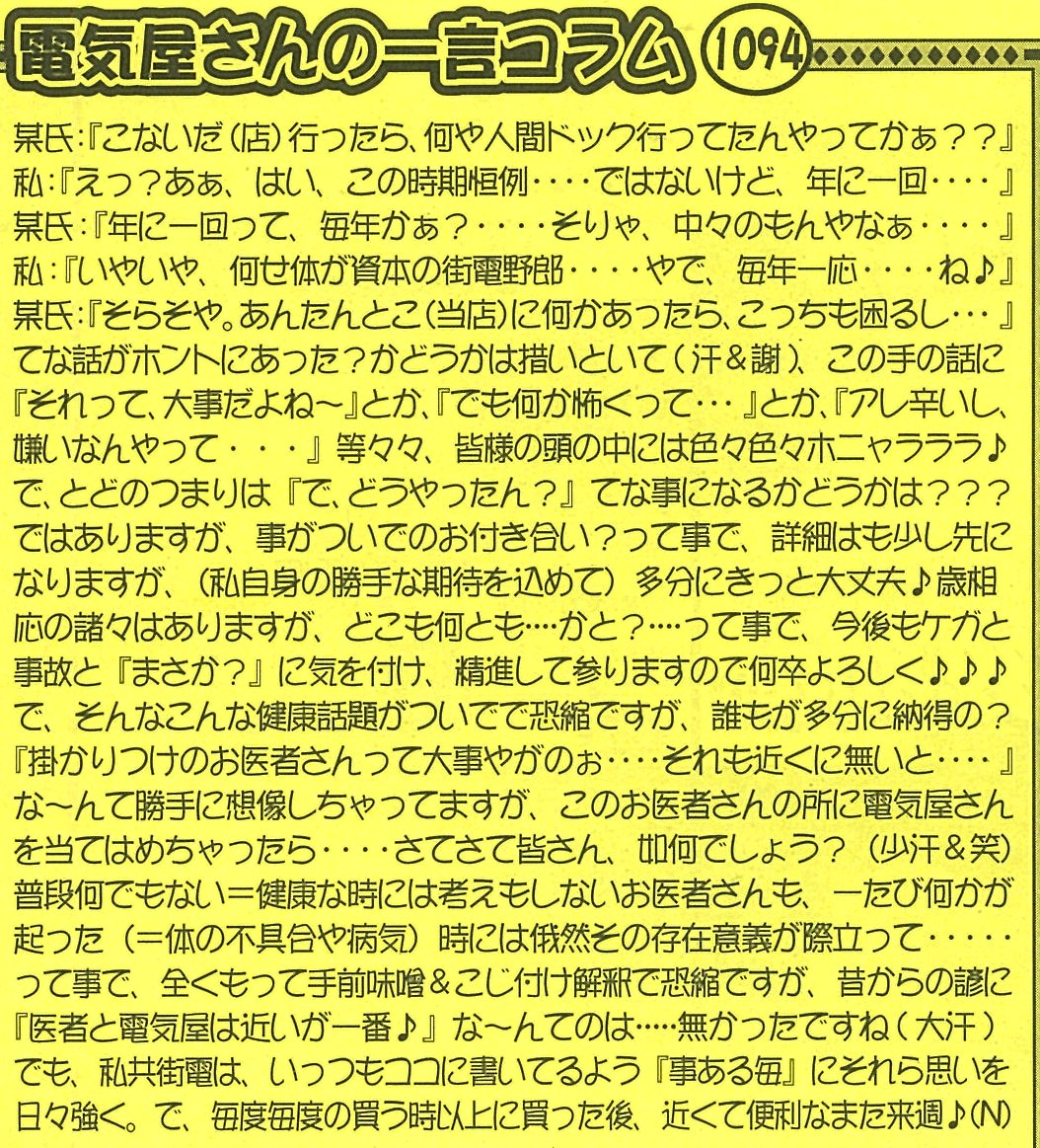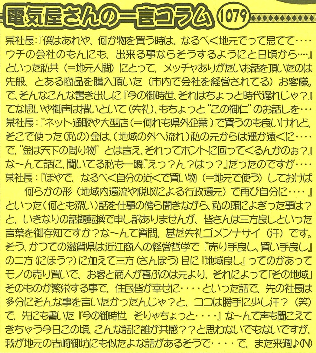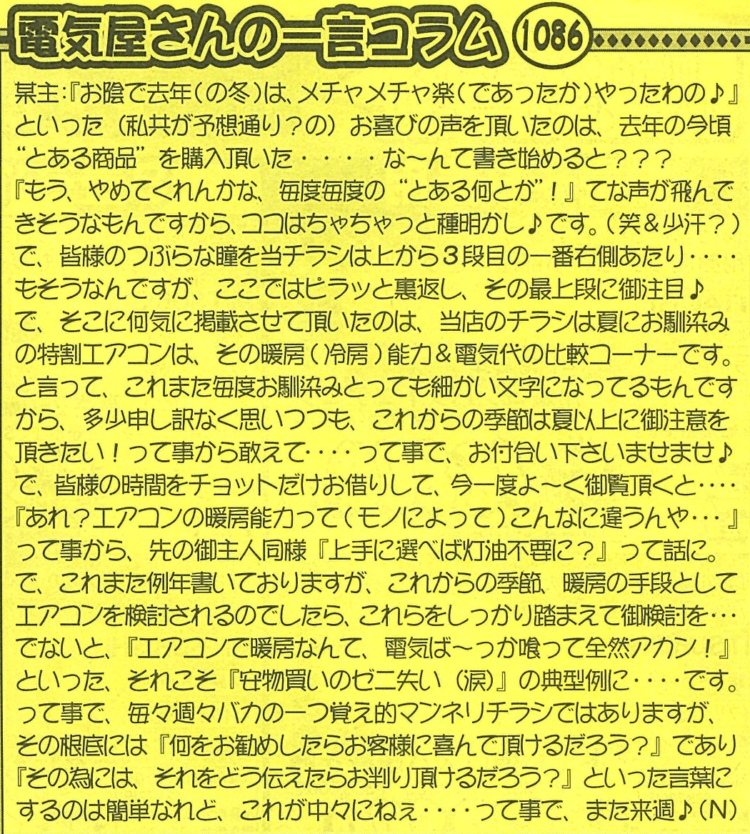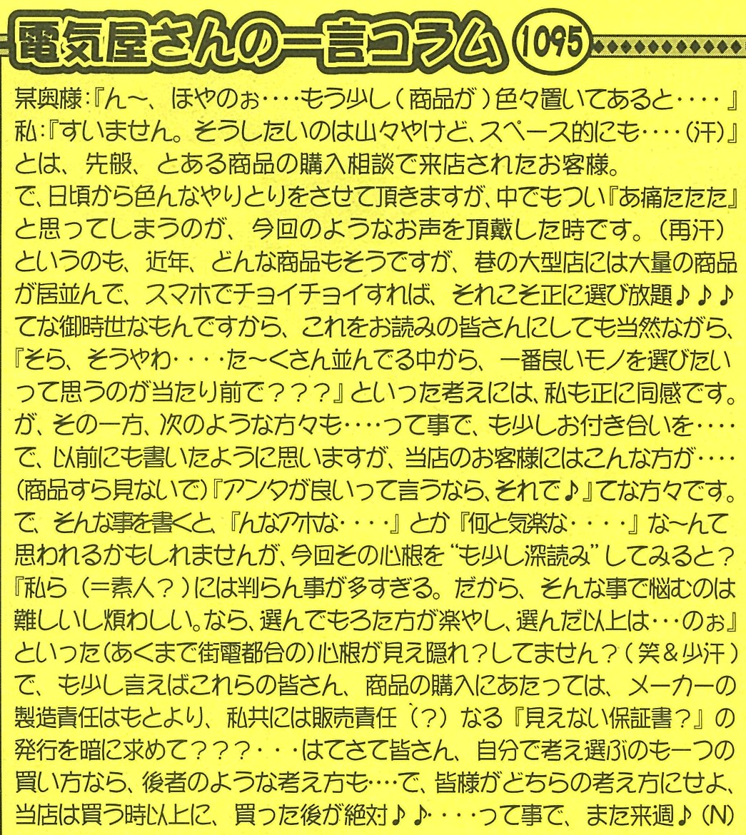 このコーナーは、当店が毎週日曜に新聞折込をしている日曜チラシに約20年以上前から連載の『電気屋さんの一言コラム』を掲載してあります。