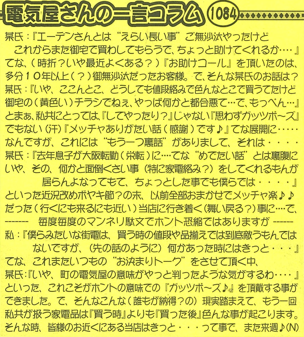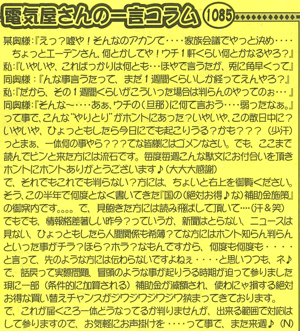 このコーナーは、当店が毎週日曜に新聞折込をしている日曜チラシに約20年以上前から連載の『電気屋さんの一言コラム』を掲載してあります。